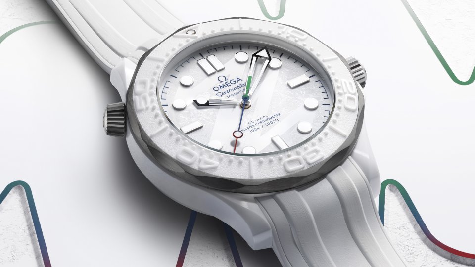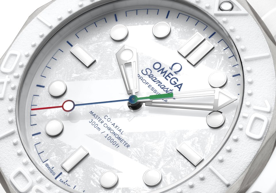 オメガは今大会を記念した独自の演出をダイアルに施しました。ホワイトセラミック製のダイアルには、レーザーによるフロスト加工があしらわれ、ミラノ・コルティナ2026のエンブレムにある「26」から着想を得た、指先でなぞったような軌跡が浮かび上がります。デザインを完成させる要素として、ロジウム仕上げの針とインデックスにはホワイトのスーパールミノヴァが充填され、中央の秒針には、大会ロゴと呼応するレッド、ブルー、グリーンのグラデーションが彩りを添えています。