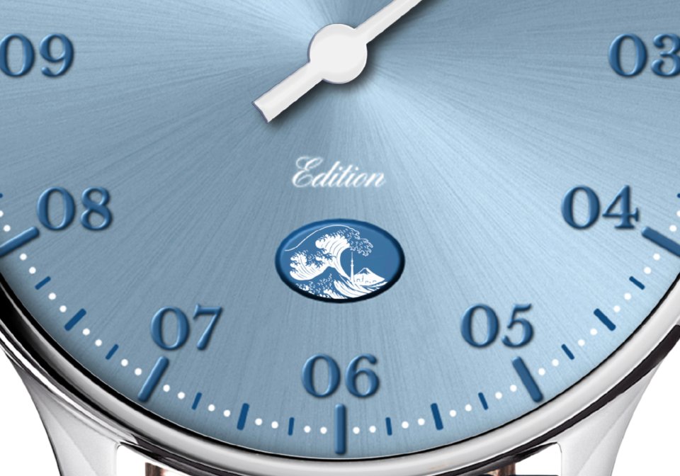 さらにケースバックには、その意匠を拡大し、富士山や躍動する波、そして現代日本を象徴するタワーのシルエットを重ね合わせた特別な彫刻を施しています。