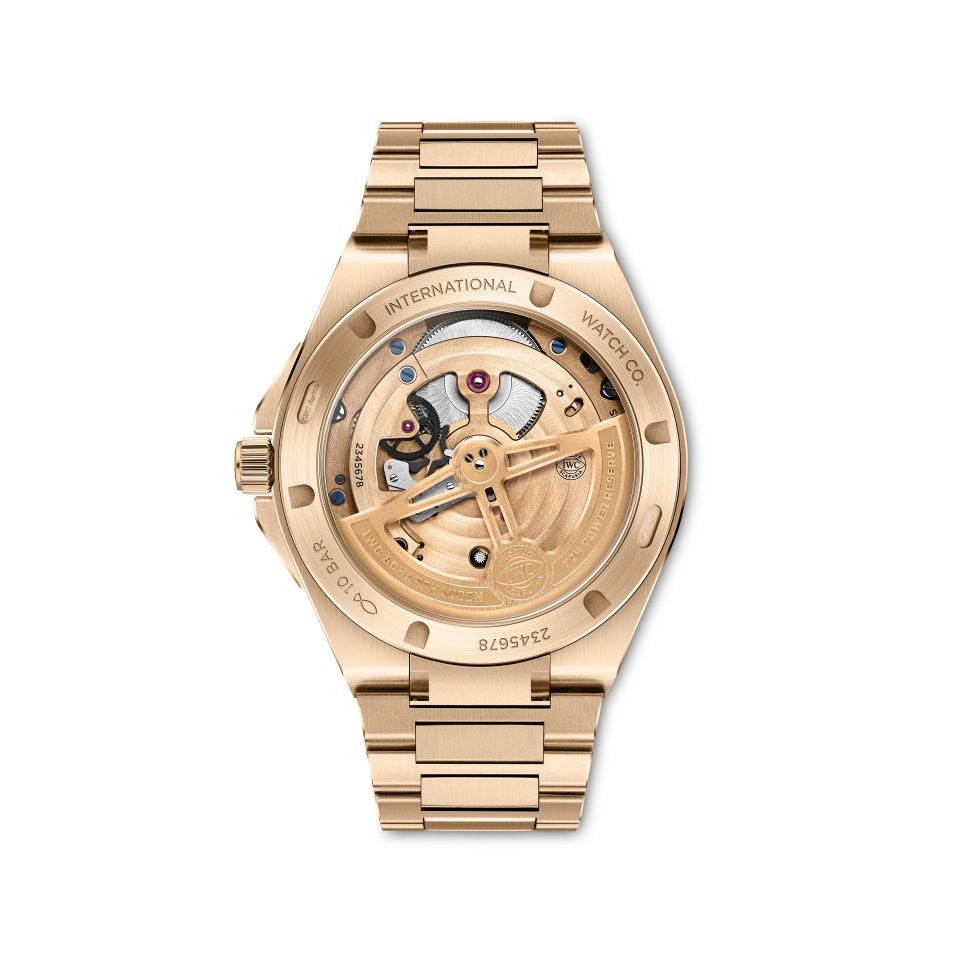 100本限定生産の「インヂュニア・トゥールビヨン 41」 (Ref. IW345901)は、18Kレッドゴールド製の41.6 mmの ケースと一体型ブレスレットを備えています。個性的なベゼル、リューズガード、そしてリューズも同じ貴金属が用いられています。ベゼルをケースリングに固定する機能的なネジは、従来のゴールド合金よりもはるかに硬度の高い素材である18 ct Armor Gold®製です。インヂュニアの特徴的な 「グリッド」パターンが施された独特な構造の文字盤が、魅力的な質感と深みをもたらし、そのダークオリーブグリーンの色合いがゴールドと美しいコントラストを織り成します。針にはゴールドメッキが施され、手作業でひとつひとつ取り付けられるアプライド・インデックスはゴールド製です。さまざまな技術を融合させた「インヂュニア トゥールビヨン 41」 は、外観上の仕上げにも非常にこだわっています。ケース、ベゼル、ブレスレットのリンクはサテン仕上げで、エッジはポリッシュ仕上げ。ゴールドは「インヂュニア」の複雑なラインとアングルを特に際立たせ、ジェラルド・ジェンタにインスピレーションを得たデザインの彫刻的な美しさを強調します。