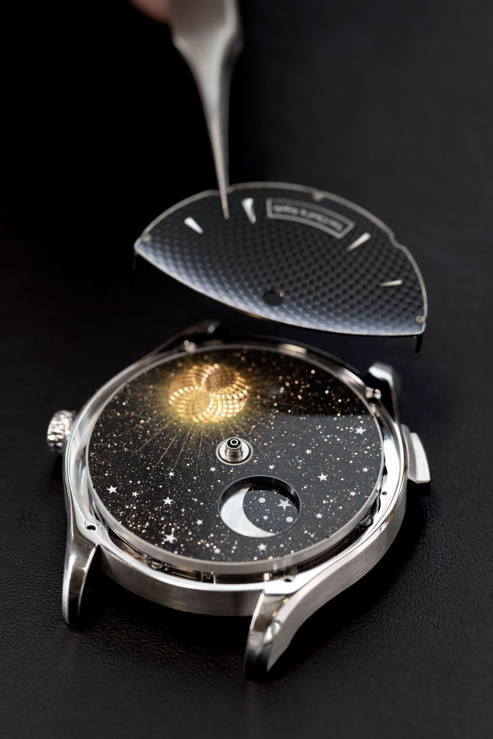 1日の移ろいとともに、ギヨシェ彫刻を施したゴールドの太陽が次第に姿を消し、代わって、アクリルで描かれた星々に囲まれたホワイトマザーオブパールの月が現れます。ブラックからホワイトへとグラデーション状にペイントされたギヨシェ彫刻のマザーオブパールによって表現された地平線の彼方に、2つの天体がそれぞれ現れては消えていくのです。