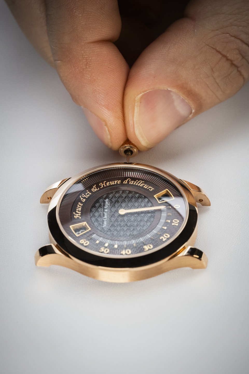 分針が60の目盛りに達すると瞬時に0位置に戻ると同時に、時間表示が次の数字にジャンプします。こうして、新たな旅路を告げる新しいサイクルが始まるのです。また、操作性を高めるため、ムーブメントの巻き上げ、2つのタイムゾーン設定、分針の調整をひとつのリューズで行うことができる仕様になっています。