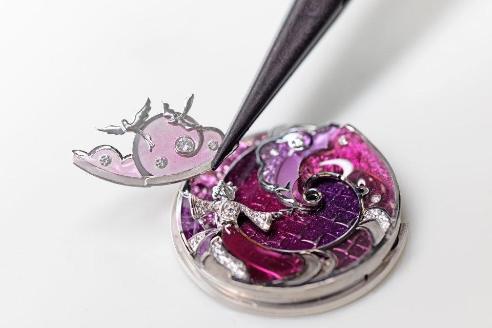 文字盤へのゴールドの鳥をあしらったプリカジュール エナメルの雲の取り付け