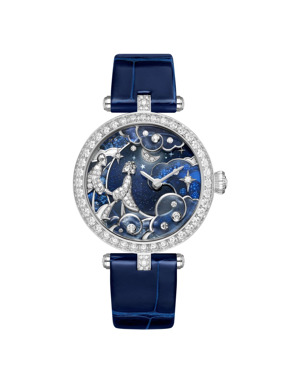 ブルーの色彩が美しく響き合うレディ ランコントル セレスト ウォッチは、星降る夜空を背景に手を取り合う恋人たちの姿を描いています。プリカジュール エナメルにダイヤモンドをちりばめた煌めく雲の向こうに、ホワイトゴールドで象られたシルエットが現れます。ローズカットダイヤモンドで表現された2人の顔から、互いをうっとりと見つめ合う様子をはっきりと伺うことができます。