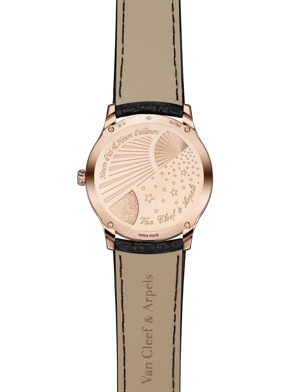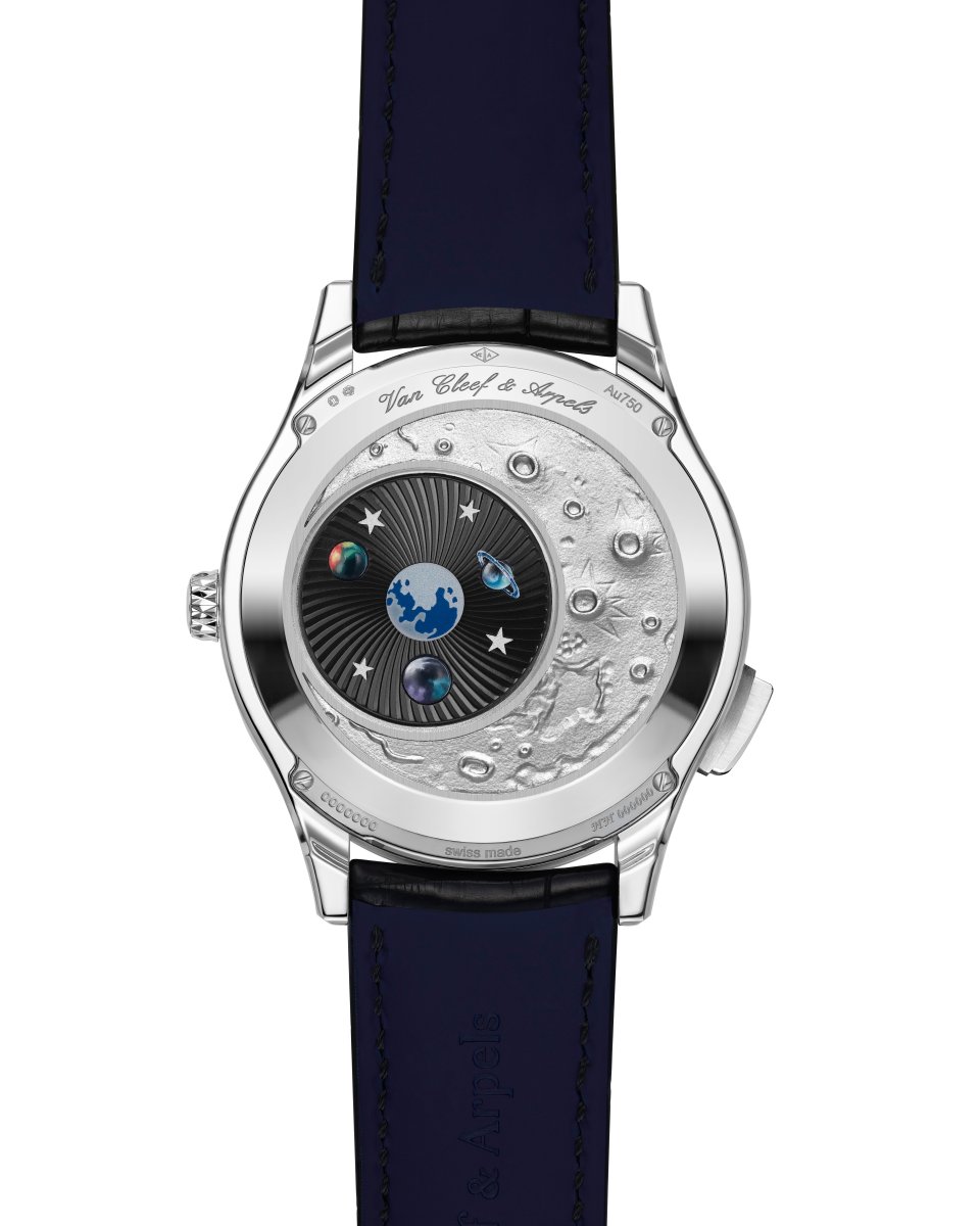 クリスタルはさらにミニアチュール ペインティングによる惑星で彩られ、ギヨシェ彫刻を背景にやわらかな輝きを放っています。つまりケースバックには、文字盤に表れた視点を反転させる形で、地球からではなく月から眺めた宇宙の姿が描かれているのです。