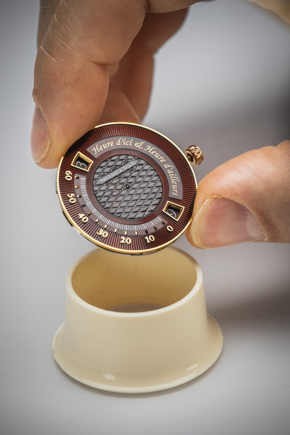 文字盤上部の窓に表示される基本の時間「ユール ディシ(ここの時間)」と、下部の窓に表示される2つ目の時間帯「ユール ダイヨール(あちらの時間)」は、2つのセクターギアによって2枚のディスクとレトログラード分針が同期されることで同時に進みます。