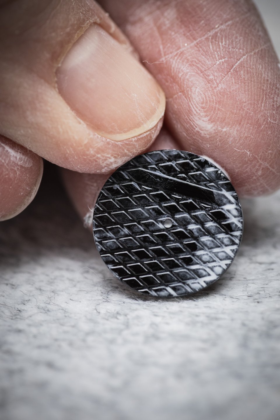 この最初の難題に加え、メゾンのホールマークを想起させるピケモチーフのエナメルへの刻印、外縁に向かって放射状に広がるギヨシェ彫刻といった繊細さを要する作業が並行して進められました。これら2つの装飾に調和の取れた相互作用を生み出すために、エナメルに2つの異なる彩度を持たせることが求められました。塗布したエナメル層の厚みが色調だけでなく、「シャトヤンシー(変彩効果)」と呼ばれる素材内部での光の挙動にも影響を与えるからです。ヴァン クリーフ&アーペルの職人は、レリーフ状のモチーフを表現するため、吹きガラス技法から着想を得て、それを時計制作の道具に応用しました。まず均一に発色させるべく、エナメルを500度以下の低温で30時間以上熱します。その後、高温と1000度を超える超高温での2回の焼成を行うことで気泡を取り除き、成形に適した状態に整えます。成形は、手作業で金型をエナメルに押し当てて行われます。さらに最後の焼成を経て、最終的な成形段階に入ります。