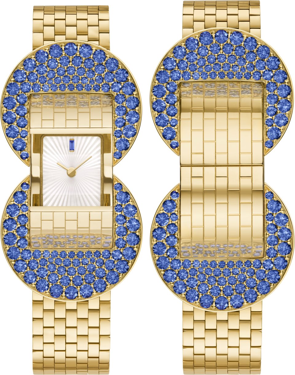 サファイアをあしらった新作のルド シークレットウォッチは、1949年のモデルを再解釈し、この伝統を継承しています。ブレスレットは、手作業で丹念に組み立てられ調整されたミラーポリッシュ仕上げのイエローゴールド製“ブリケット” リンクで構成され、手首を優しく包み込みます。しなやかなメッシュ状に連結されたリンクは、まるで繊細に編み込まれているかのようです。陽光を思わせるイエローゴールドの輝きとサファイアの鮮やかなブルーが、コントラストを成しながら調和を奏でています。ゴールドの表面にセットされたサファイアは、ふくよかな三日月のモチーフを形作っています。