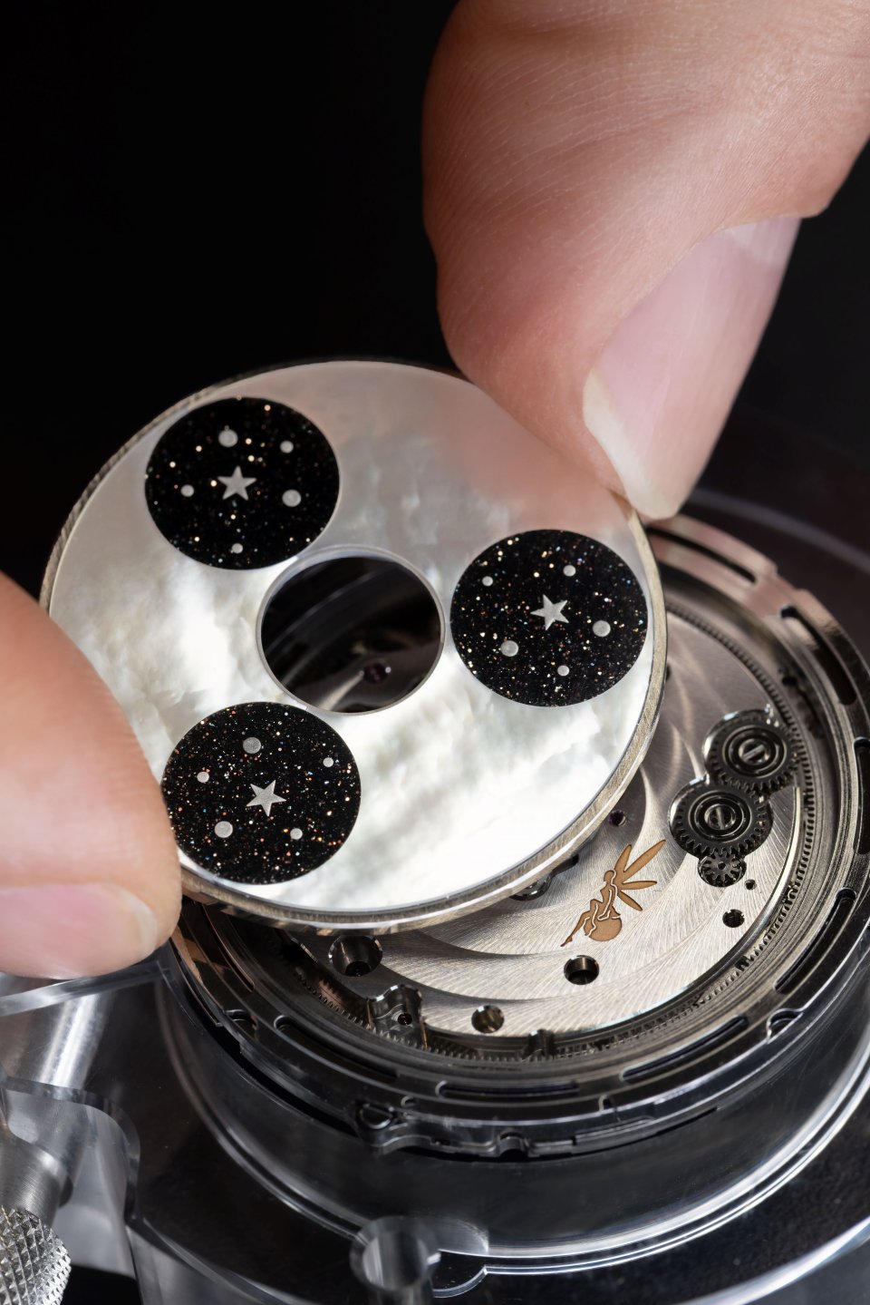 文字盤へのマザーオブパールとブラック アベンチュリンガラスのディスクの取り付け