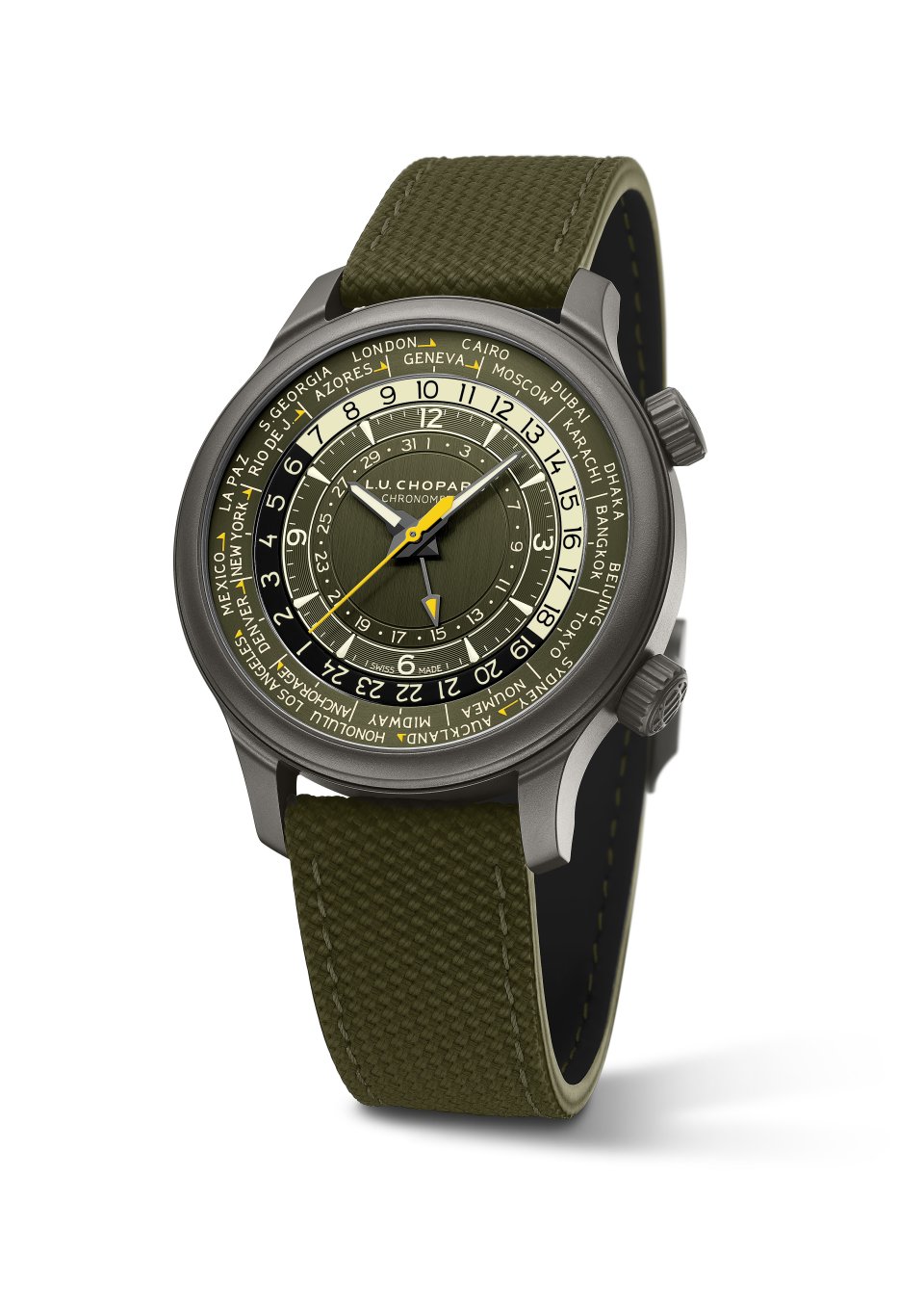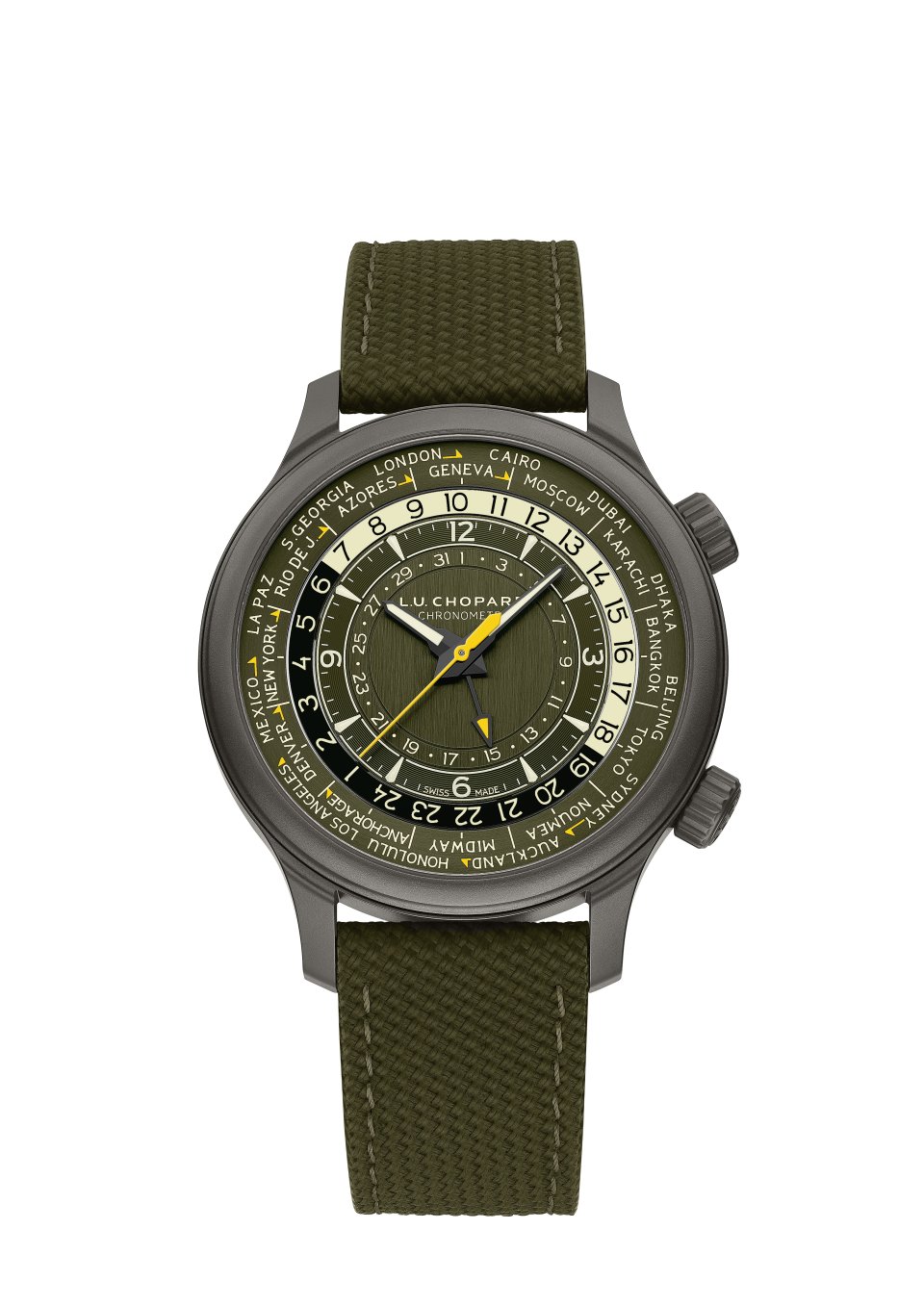カーキカラーの文字盤は、“堅牢なエレガンス”を湛えています。あふれる冒険心やミリタリーヘリテージから着想を得た洗練された色調は、ショパールがこれまでワールドタイマーに採用してきた伝統的なブラック、ブルー、シルバーのカラースキームとは一線を画す、新たな個性を表現します。