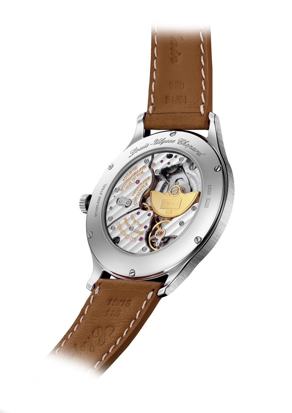 ケースの驚異的な薄型化を可能にしたのは、1996年にフルリエのショパール マニュファクチュールで設計・製造された初代ムーブメントを直系進化させたキャリバー「L.U.C 96.12-L」の採用によるものです。わずか3.30mmの薄さを誇るこの自動巻きムーブメントは、22Kゴールド製マイクロローターを搭載し、ショパールツインテクノロジーによるふたつの積載配置された香箱を効率的に巻き上げ、65時間のパワーリザーブを実現しています。
